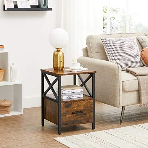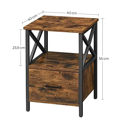 Specifikationer: Färg: Rustik brun, svart Material: spånskiva, stål Produktstorlek: 15,7″L x 15,7″B x 21,7″H (40 x 40 x 55cm) Produktvikt: 25,8lb (11,7kg) Total max statisk lastkapacitet: 66 lb ( 30 kg) Paketinnehåll: 1 x Sängbord 1 x Tillbehörsväska 1 x Instruktioner