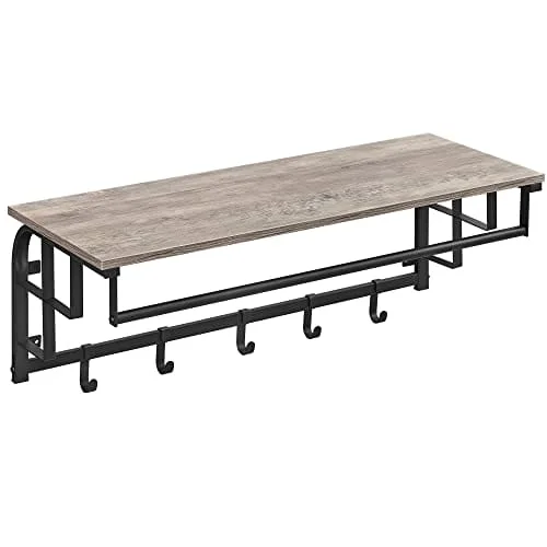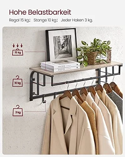 Specifikationer:- Färg: Greige, Svart Material: Spånskiva, Stål Produktstorlek: 30 x 66 x 27 cm (dxbxh)- Produktvikt: 3,3 kg-max. Hyllans statisk lastkapacitet: 15 kg-max. Statisk lastkapacitet för varje krok: 3 kg-max. Statisk belastningskapacitet för hängskena: 10 kg Paketinnehåll:- 1 x väggmonterad klädhängare- 1 x tillbehörsväska- 1 x instruktioner