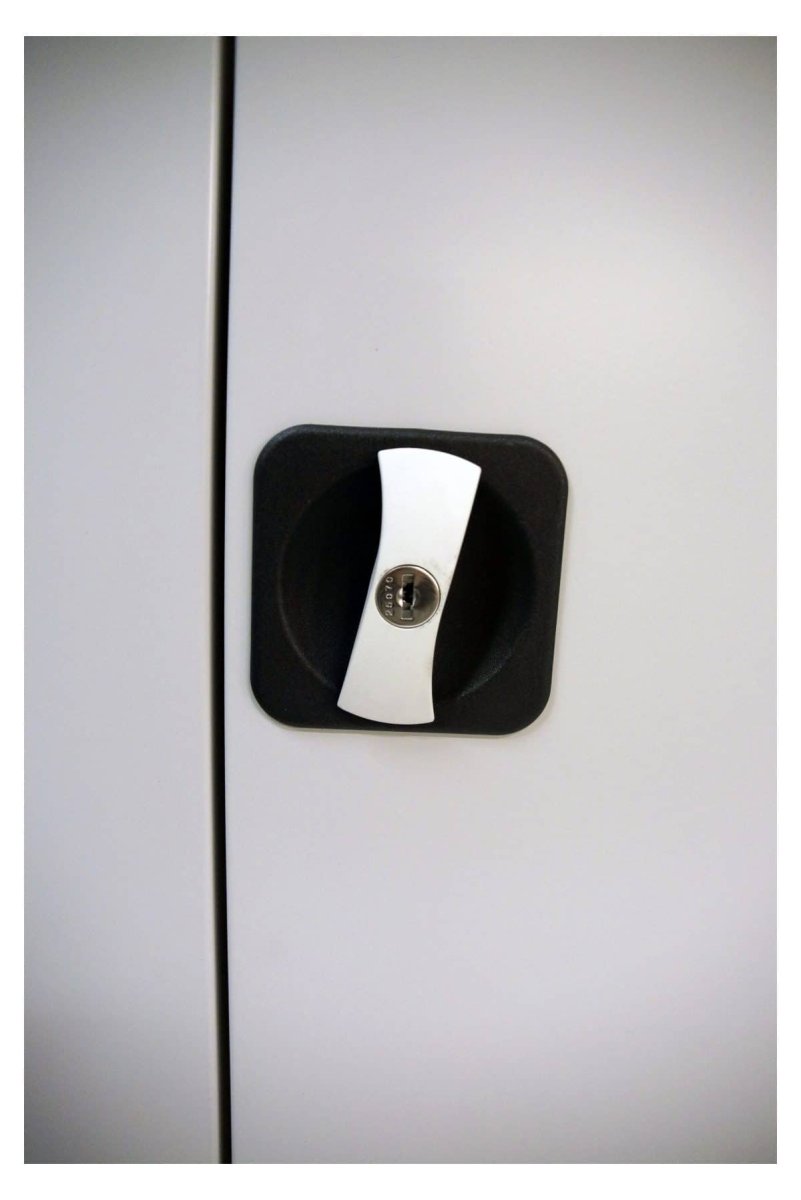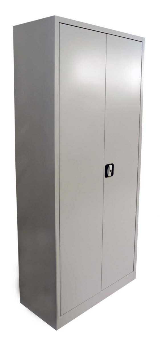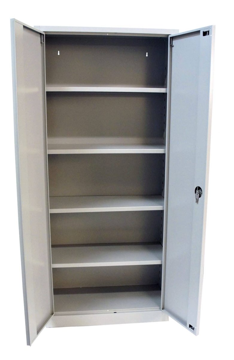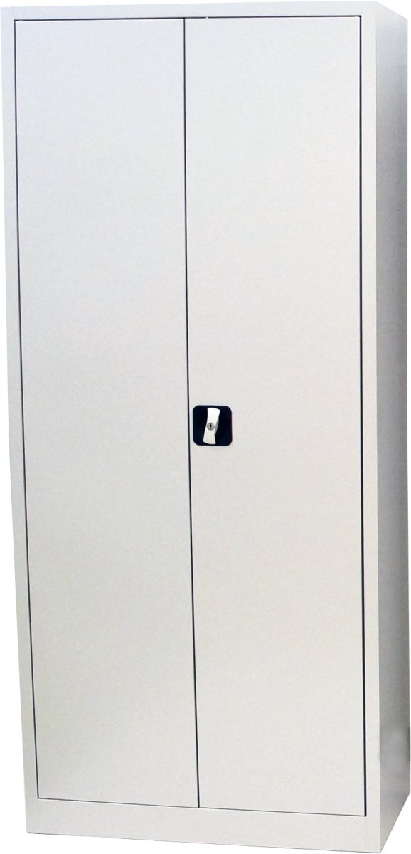 Kraftigt, helsvetsat stålskåp med spanjolettlås i dörrarna. Fyra flyttbara hyllplan ingår till varje skåp. Extra hyllplan som tillbehör. Grått (RAL 7035).